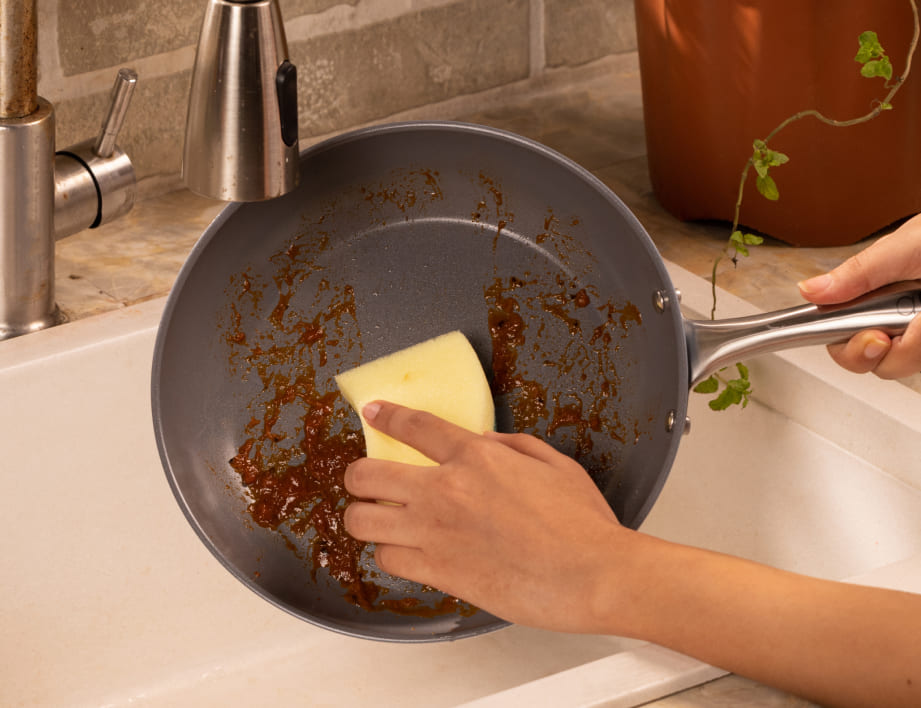 For the interior: Fill the kadai halfway with water and bring it to a near boil for about 2 minutes. Pour out the water and place the kadai on a sturdy surface such as a wooden cutting board. Carefully use a soft sponge on the warm surface, this should do the trick. For the exterior: Mix baking soda and a little water to form a smooth paste; then use kitchen paper to rub the paste over the stained area (exterior surfaces only).