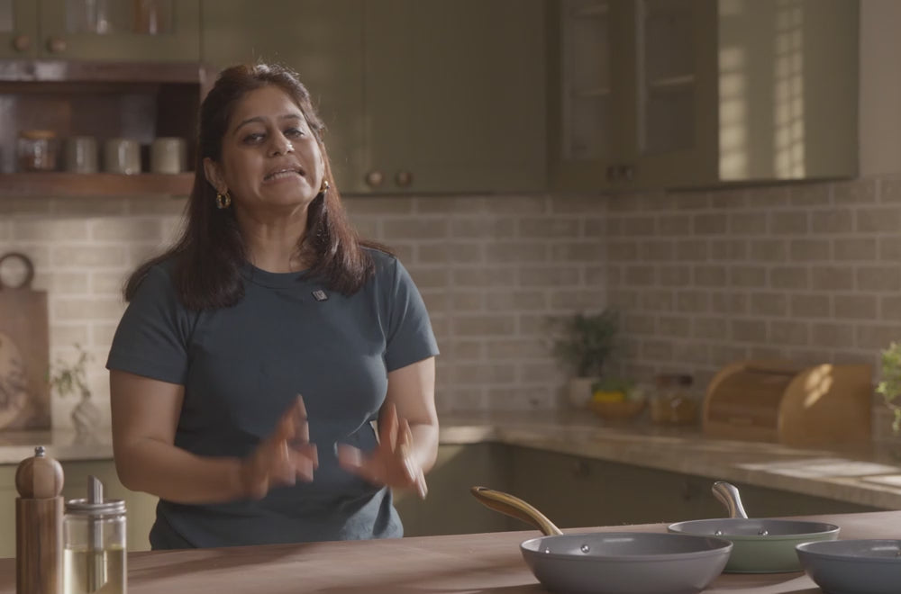 Unlike stainless steel, the Asai Ceramic Kadai is naturally non-stick, needs up to 50% less oil, is much lighter to use and comes with stay cool, silicone grip handles. Essentially, it's built for Indian kitchen.